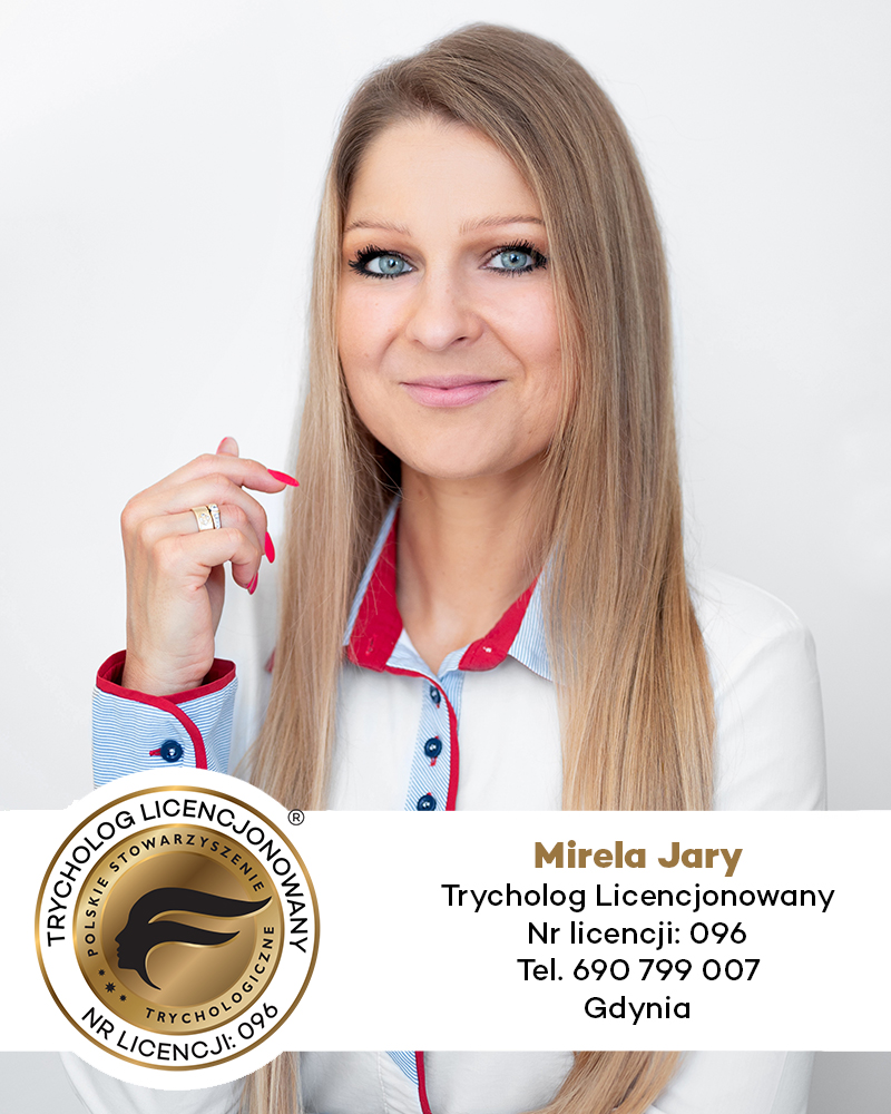 Mirela Jary jest dyplomowanym trychologiem, absolwentką studiów Wyższej Szkoły Zdrowia w Gdańsku z trychologii kosmetologicznej oraz pasjonatką zdrowia i piękna włosów. Od lat pomaga kobietom, mężczyznom oraz dzieciom odzyskać zdrową skórę głowy oraz mocne i lśniące włosy. W klinice Hairmitage w Gdyni przyjmuje jako trycholog oraz specjalista ds. transplantacji włosów.